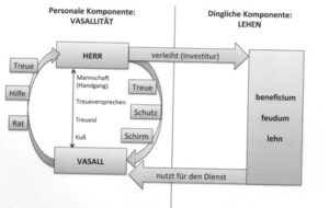 Das Lehen ist ein persönlicher Treueschwur beider Partner. Der Herr gibt dem Vasall häufig Land um den Verpflichtungen (u.a. Kriegsdienst) nachzukommen. Es ist ein System um Unterstützung zu garantieren. Die Unabhängigkeitsbestrebungen der Vasallen führen mit anderen Entwicklungen dazu, dass es an Einfluss verlor.
